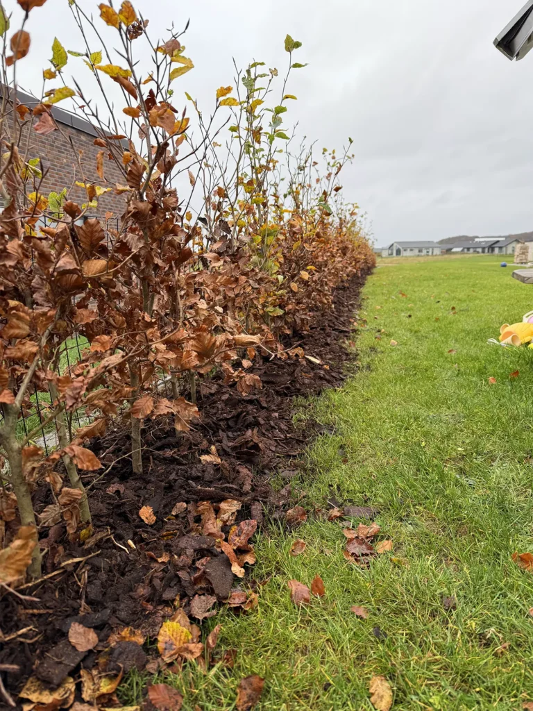 Vi har udført tre separate hæk-opgaver på tre forskellige adresser med fokus på etablering og driftssikker vedligeholdelse. Billederne viser en nyplantet hæk med træflis langs hæklinjen, hvor flisen reducerer ukrudt og hjælper med at holde på fugten i etableringsfasen. Derudover ses en længere hækplantning udført efter opmåling og snor, så planteafstand og linjeføring bliver ensartet på større stræk. Til sidst viser billederne en tæt, stedsegrøn hæk som afskærmning langs indkørsel og have, hvor plantebæltet er klargjort og jorden samlet pænt op langs kanten. Fælles for opgaverne er lige linjer, korrekt plantedybde og en løsning, der giver læ og privatliv – og som er nem at holde pæn med løbende klipning og enkel pleje.