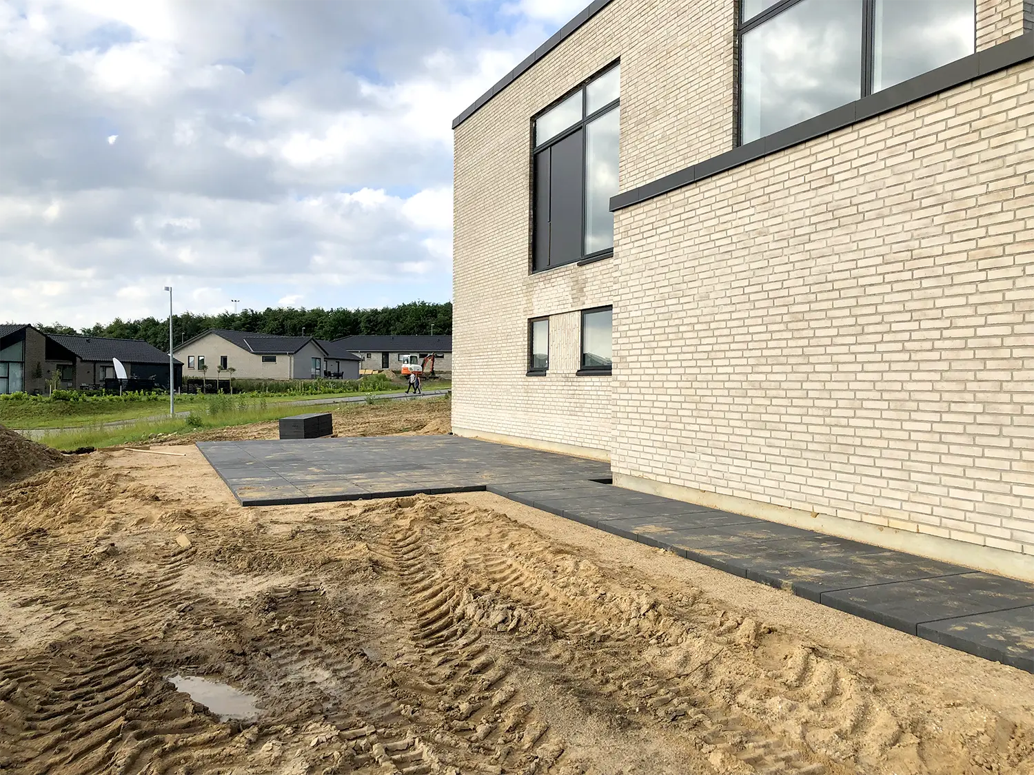 Billederne illustrerer sorte, slidstærke fliser til indkørsel og garage med dobbelt port, flisebelagte terrasser med integreret belysning og dræn, samt flot overgang til grusarealer, sten og nyplantede buske/træer. Vi håndterer alt fra grundforberedelse, dræning, underlag og præcis lægning af fliser til æstetisk finish med gruskanter og beplantning. Resultatet er funktionelle, vedligeholdelsesvenlige og stilrene udendørsarealer – perfekt til parcelhuse og nybyg i Horsens, Skanderborg, Silkeborg, Ry, Gedved, Mårslet og omegn. Lad os anlægge din belægning i dag!
