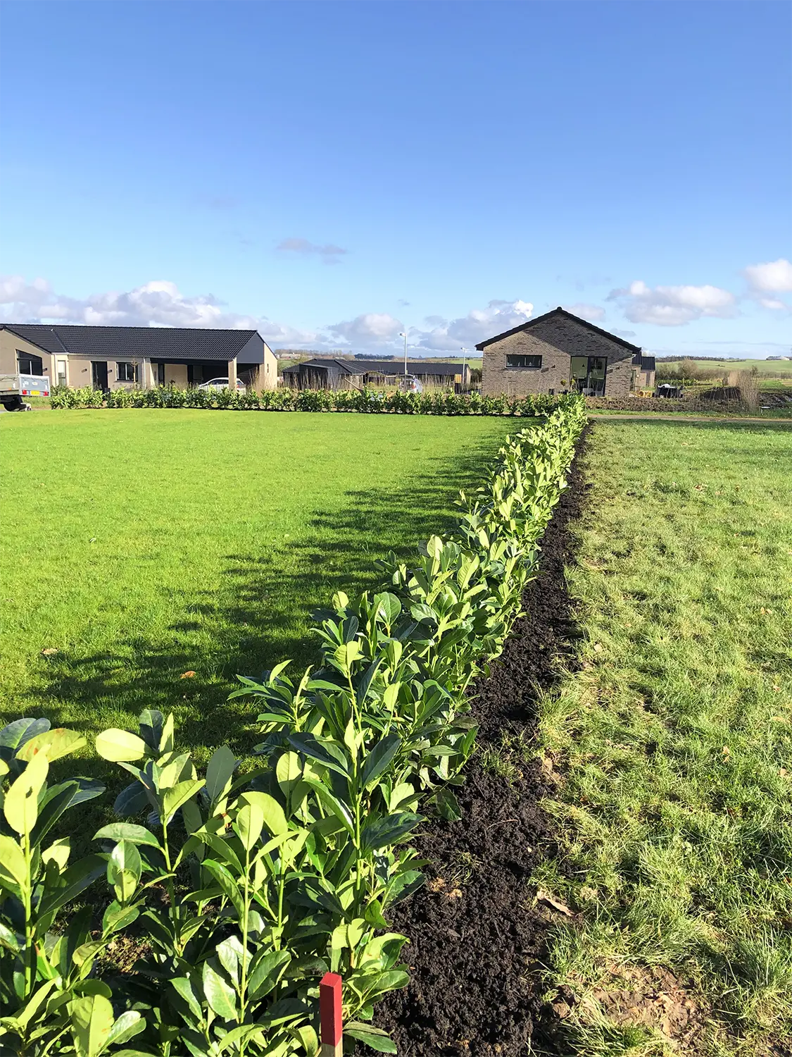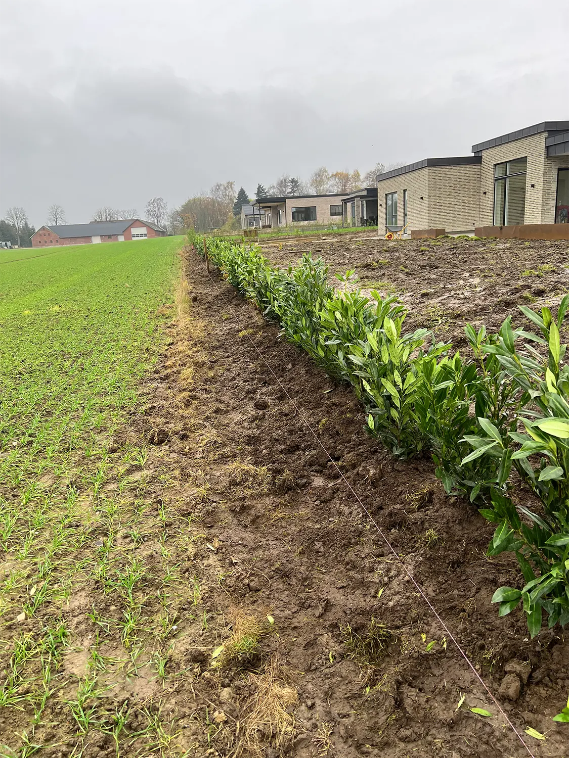 Vi har forberedt og plantet en ny kirsebærlaurbær hæk med præcis opmåling og ensartet planteafstand, så der opnås en tæt, stedsegrøn afskærmning. Billederne viser levering af kirsebærlaurbær i potter, udlægning langs snor og afmærkning, samt etablering af et sammenhængende plantebælte med klargjort rende og løsnet jord. Der er fokus på lige linjer og korrekt plantedybde, så rødderne får god kontakt med jorden og planterne står stabilt fra start. Efter plantning er jorden samlet og tiltrykket, så hækken etablerer sig hurtigt og kan klippes tæt, når den er vokset til. Løsningen er velegnet til nybyg, parcelhuse og større grunde, hvor man ønsker læ, privatliv og en grøn afgrænsning året rundt.